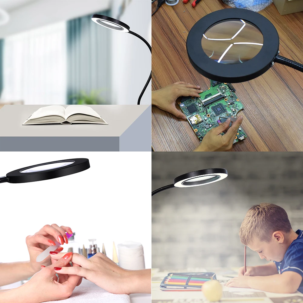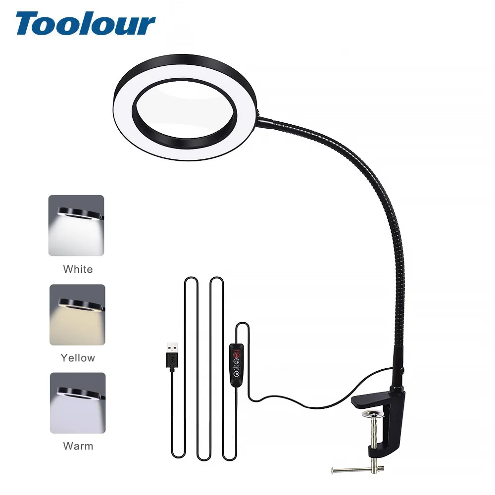Toolour USB 5X Magnifying Glass LED LightTable Clamp Flexible Arm Large Lens Desk Lamp for Reading